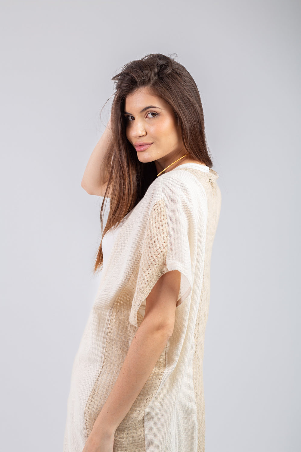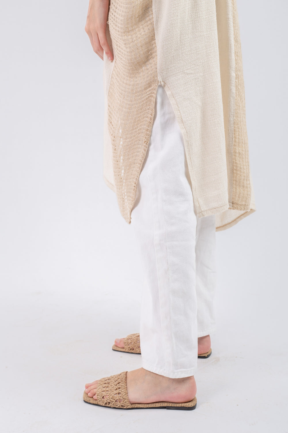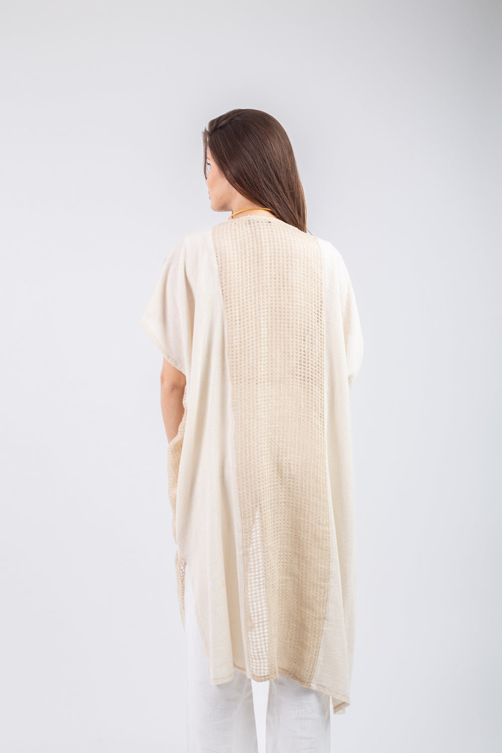 The Flow Cardigan is a breezy blend of matte net and pure linen, designed for effortless layering. Its airy structure and natural texture create a relaxed silhouette that moves with ease, making it a timeless piece for laid-back elegance.