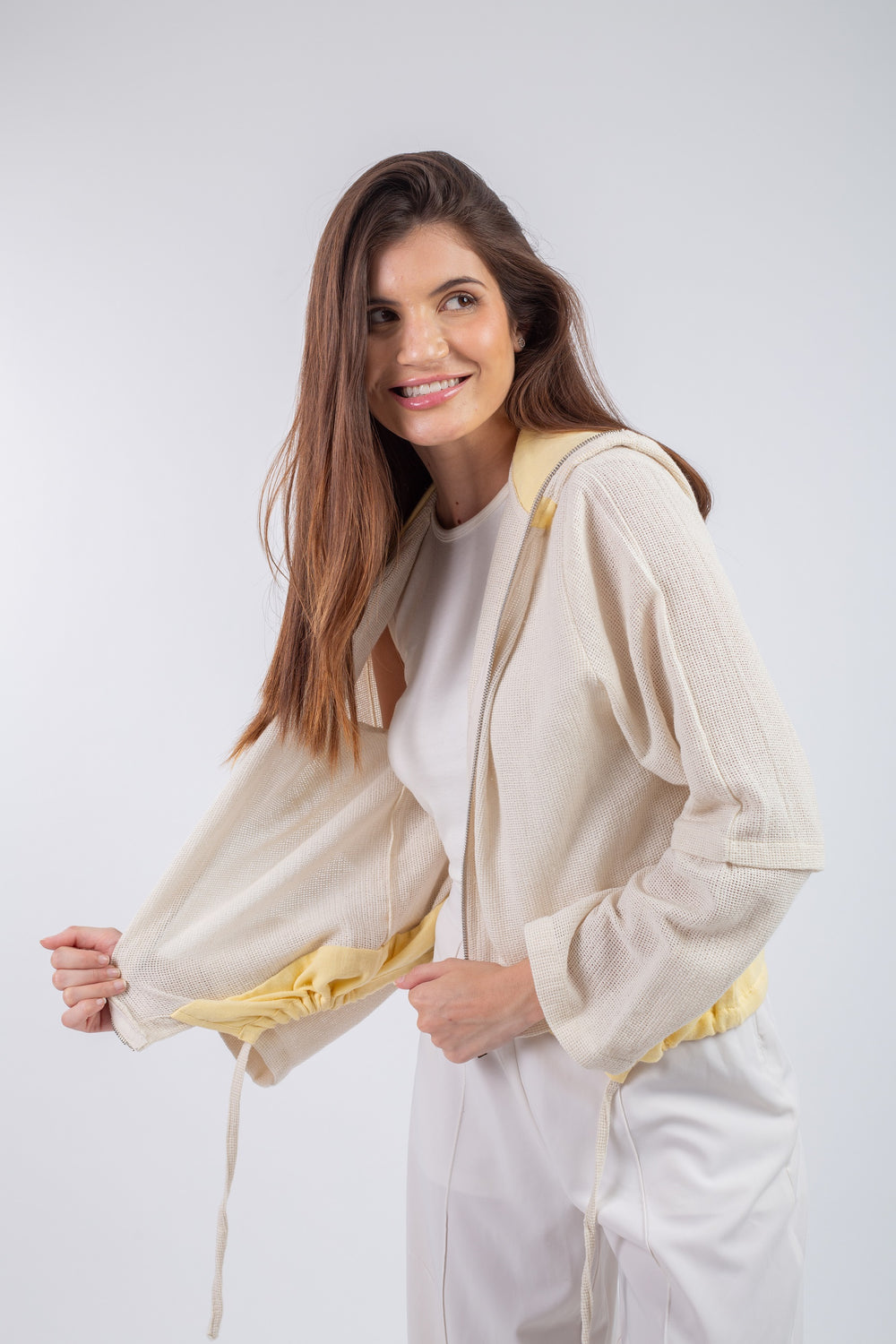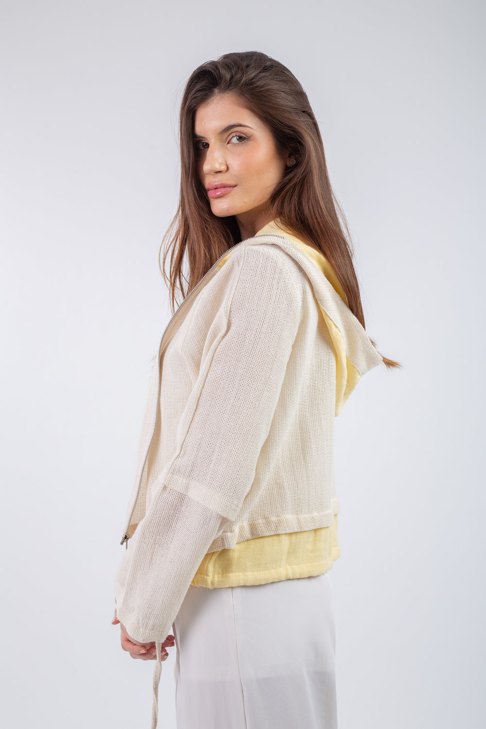 The Layered Jacket is a modern mix of cotton and net fabric, designed with a front zipper and a soft, structured silhouette. The contrast in textures adds depth and dimension, making it a standout piece for everyday layering.